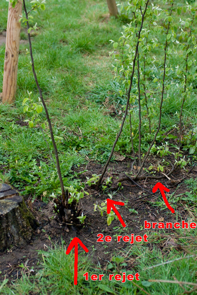 A sa base il y a un petit rejet très vigoureux que je tente de canaliser pour refaire un arbre et il y a aussi un autre rejet que je suppose non franc un peu plus loin.
