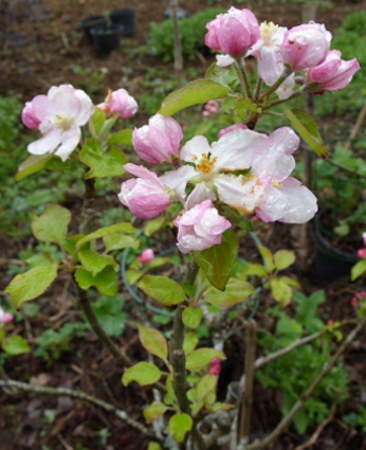 En automne 2011, on m'a donné 2 branches d'une variété de pommier de moi inconnue et qui se bouture facilement m'a t'on dit. Il y a comme de petites "tumeurs" sur la base des branches, qui une fois en terre doivent donner rapidement des racines. Effectivement, plantées sitôt arrivées, peu arrosés depuis, elles ont cependant déjà fleurs et feuilles! Auriez vous entendu parler d'un tel pommier?