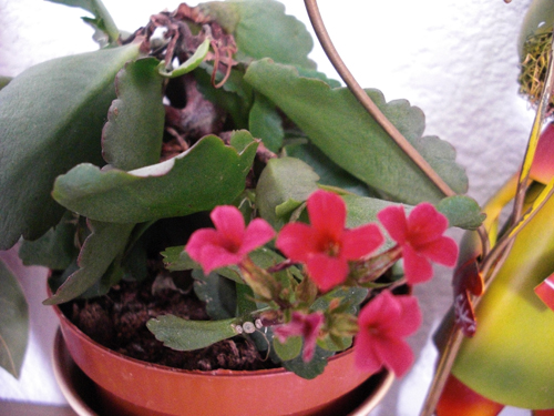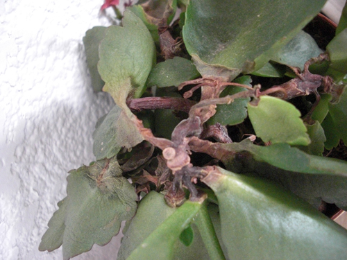 J'ai chez moi un kalanchoé souffrant, et je ne sais pas quoi faire pour le sauver... voilà la situation : on a offert cette plante à mon compagnon il y a environ quatre mois. Je ne sais pas du tout d'où elle vient, donc je ne connais pas sa qualité, sa résistance et tout. Il y a un mois, nous avons décidé de le mettre dehors pour qu'il prenne l'air... pas de chance, on l'a oublié deux ou trois jours, et il y a eu beaucoup de vent et de la pluie. Je pense qu'il a eu un peu trop d'eau (cache-pot étanche), et le vent n'a pas dû l'aider.
