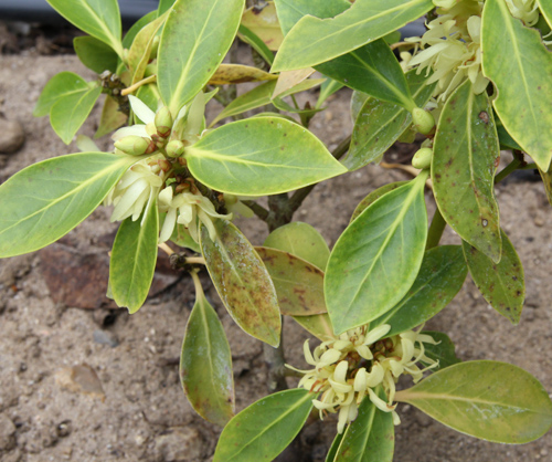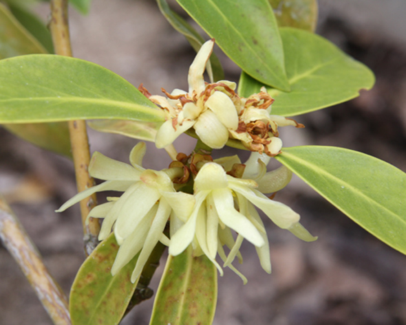 cet arbuste planté à l'automne dernier a passé le coup de froid de février sans coup férir à Orléans (avec une petite protection quand même)... Avec sa petite allure d'ilang ilang, il sera sûrement dans quelques années une des attractions de mon coin "tropical rustique". Qui devinera ce que c'est ?