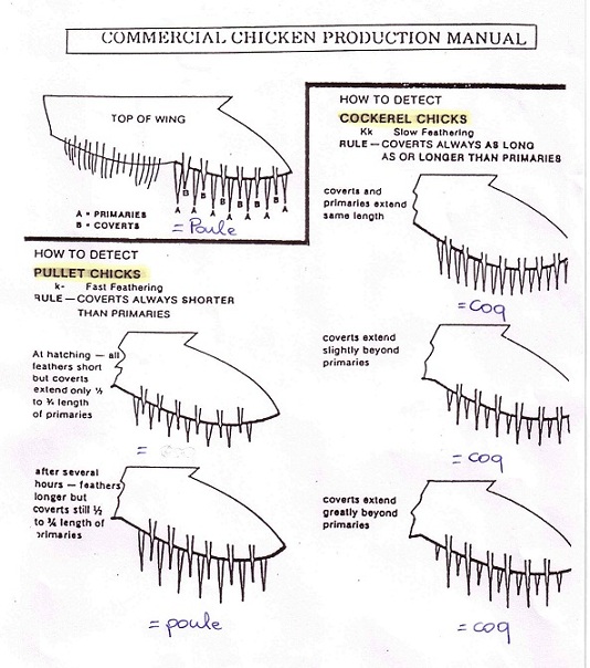 Sinon, les femelles s'emplument plus vite et font leur queue avant les mâles. Quand les poussins sont plus grands si vous dépliez l'aile, les femelles ont toutes les extrémités de leur plume au même niveau alors que les mâles ont un décrochement entre les plumes de "l'avant bras" plus longues que celles du "bras". Puis vient la crête quand ils sont plus âgés.