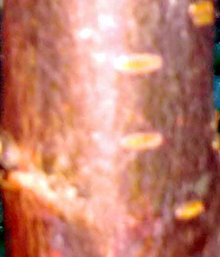 Ce soir même, en inspectant les troncs de mes deux petits cerisiers, j'ai découvert cela. Ça me paraît être un début de chancre. Qu'en pensez-vous ??? J'ai brossé avec de l'eau et les petites cloques ont disparu pour laisser apparaître le tissu vert sous l'écorce. Je vais traiter dès demain avec un produit anti-fongique, peut-être la Bouillie Bordelaise. Au pinceau, ça devrait le faire. L'espèce de cloque est partie comme de la poudre ou de la moisissure (champignons).