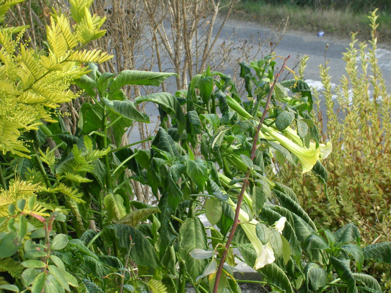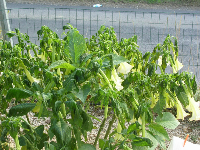 Bon, ben c'est fait, mes brugs ont eu un coup de gelée, il a fait 0° cette nuit, et ce soir à 19 h, il y a déjà -1°, et je vs mets la photo de mes brugs prise de ma fenêtre, après ça je vais les tailler et les couvrir, c'est dommage ils étaient si beaux