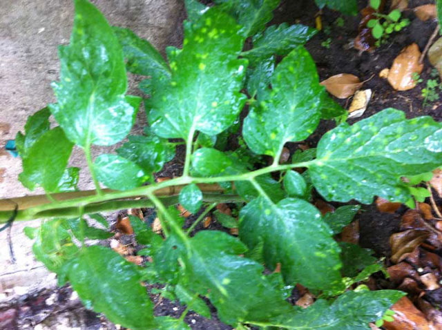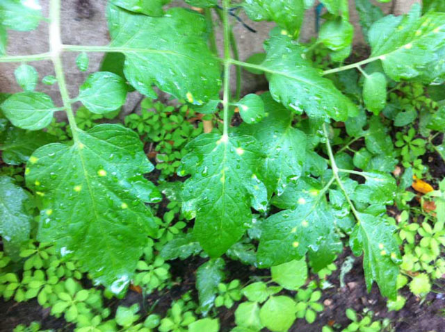 Mes 2 petits potagers poussent bien, mais là depuis quelques jours les 12 plantes de la nouvelle plantation ont développés des tâches ronds jaunes sur les feuilles, (voir les photos). A part ceci, elles ont l'air de pousser bien (les fleurs jaunes arrivent et les fruits commencent à former.