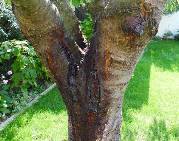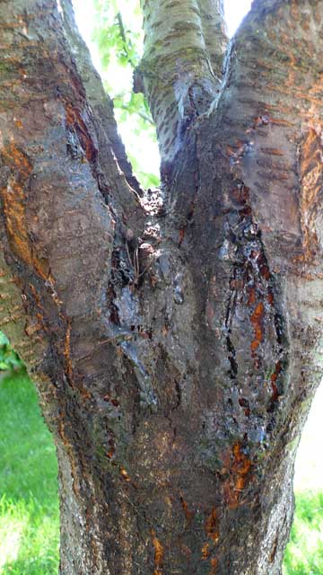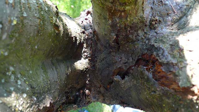 Voici quelques photos de mon cerisier qui se craque au niveau du tronc et de la fourche.