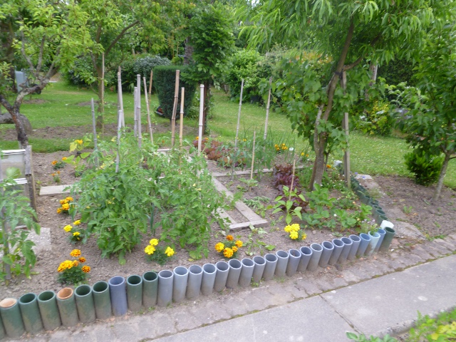Les tubes que tu vois au premier plan c'est une bordure pour ne pas faire tomber la terre. Mais je pense que tu as remarqué que ce n'est pas le même endroit où il y a les carrés potager... en faite c'est chez mon papy qui me laisse depuis 2 ans un bout de terre et c'est donc lui qui a fait les bordures avec des tubes coupés.
