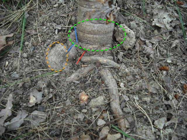 Autre chose que je trouve intrigante : ce bourrelet au-dessus du collet (ovale pointillé vert). Ça fait penser à une sorte d'étranglement qui correspond à une zone de conicité inversée dans le bas du tronc (le tronc semble presque plus étroit au ras du sol qu'il ne l'est 15 ou 20 cm plus haut). Il y a aussi une plaie juste au-dessus dont on aurait pu se passer (accident de tondeuse ou de rotofil ?)