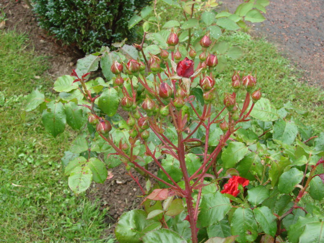 J'ai sur un seul rosier un doute sur la possibilité d'avoir des gourmands. De grandes tiges plus claires, des series de feuilles par 7, et des grappes de boutons qui ont du mal a s'ouvrir.