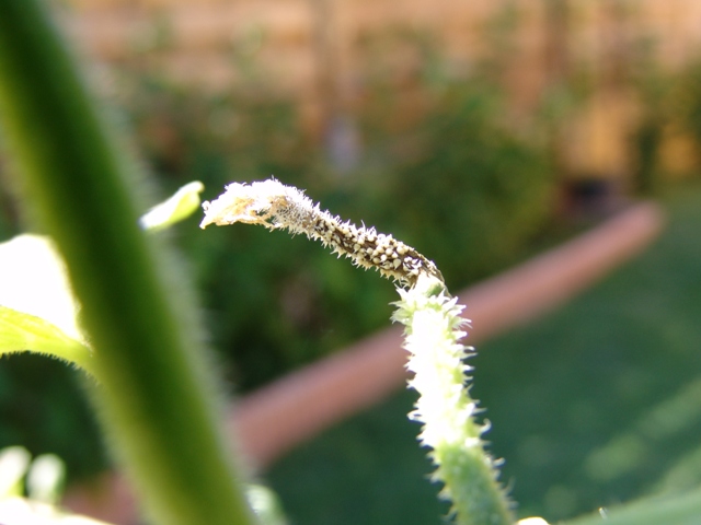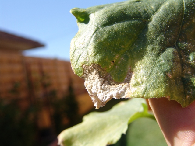 Ceci ressemble à de l' oïdium . Ôte les feuilles très atteintes et traite le reste au soufre rapidement , toutes les feuilles et les coeurs , en soirée .