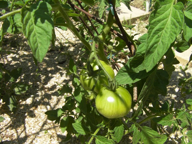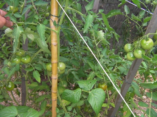 - des dizaines de pieds de tomate avec variétés connues et inconnues plus des semis spontanés, ce qui nous donne: coeur de boeuf, russe, noire de crimée, watermelon supertsteack, green zebra, brandywine, andine cornue, montfavet, fournaise, mirabelle jaune, miel du mexique, caro rich, ananas, orange queen, gregory altai, kaki, ... ET dernièrement on m'a donné un vingtaine de plants que des variétés anciennes!