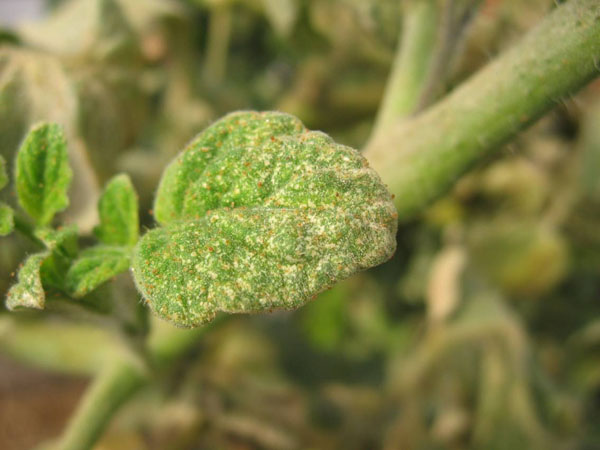 Le dessus des feuilles présente de minuscules mouchetures qui partent du point d'insertion du pétiole et s'étalent progressivement à toute la feuille. La feuille prend une teinte grisatre caractéristique.