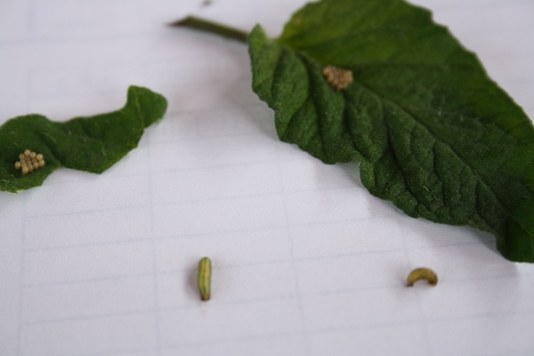 J'ai quelques soucis avec plusieurs de mes tomates. J'ai des pucerons mais il me semble impossible que ce soit les responsables. Les feuilles sont toutes fines avec des endroits ou il n'y a que la nervure. J'ai bien examiné tous les pieds et j'y ai trouvé ceci. Qu'en pensez-vous.