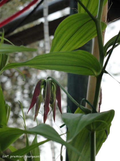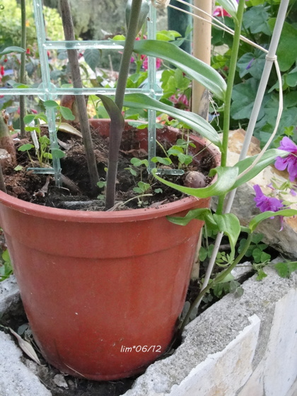 Le pot trainait dans un coin avec un rhisome qui dépassait ,et qui a fait le bonheur des limaces !quand j'ai lu que ce rishomes était un bulbe ,j'ai mis le pot dans cette jardinière de géranium,surprise des tiges ont surgi ,sitot mangé par des limaces!!apres avoir éliminé ces bestioles je surveillais de près mon gloriosa et voila le résultat