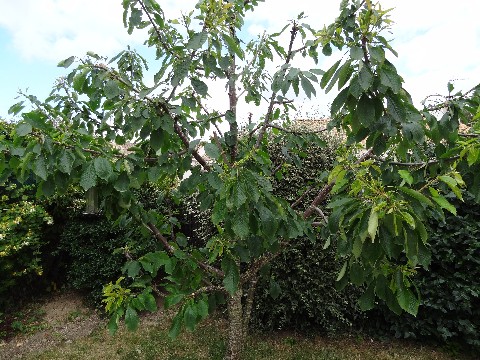 dans la série des SOS, voici une photo de mon cerisier nain, tout moche. C'est un bigarreau van que j'ai planté en pleine terre il y a environ 7 ans. Cette année il n'a quasiment rien donné mais pour mon voisin c'était pareil. Mon problème est que le jardin est tout petit, c'est pourquoi j'avais pris un nain, qui ne devait pas dépasser 2 m mais il me fait chaque année de longues pousses latérales....je sais qu'un cerisier ne doit pas se tailler, mais je n'ai malheureusement pas le choix, c'est pour çà qu'il est si moche. En fait, je reconnais que je ne sais pas du tout comment lui donner une forme....c'est d'ailleurs sans doute trop tard. J'ai vu que l'idéal est de donner une fome quenouille qui suppose un tronc très court.