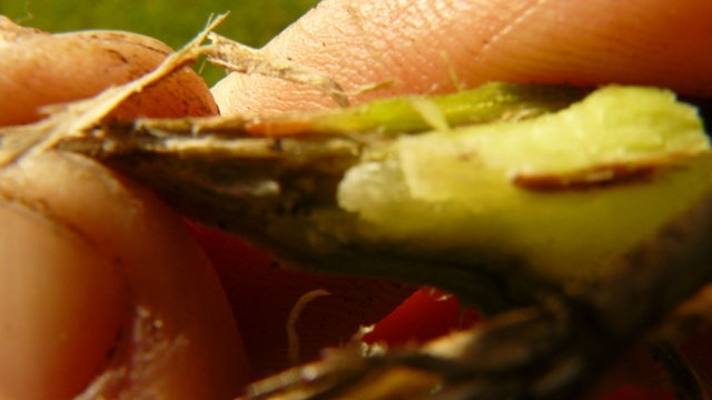 Il y a un déperissement du pied qui blanchit et se dévitalise, jusqu'à devenir ligneux, ceci à la base du pied.