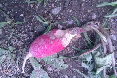 Depuis quelques jours, mes radis sont croqués par une bêbête avant la récolte. Je précise qu'ils sont croqués uniquement sur la portion hors de terre...