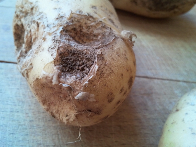 J'ai arraché mes premières pommes de terre primeur et j'en ai trouvé environ 10% de grignotées, pas creusées mais grignotées "proprement", un peu comme quand on croque une pomme. C'est pas catastrophique pour l'instant, on enlève la partie grignotée mais je suis curieux de savoir qu'est ce qui se permet de vandaliser mes patates.