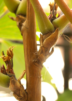 Depuis 1 mois maintenant, ses grandes feuilles commencent à courber, les pointes jaunissent et noircissent sur 2mm aux extremités. Mais le pire c'est que les jeunes pousses qui sont apparus sur le tronc, sont noirs et tous secs, recourbés sur eux même et j'ai remarqué une petite toile commencer à envelopper le tronc à la base des feuilles. J'ai peuuur!!!!! (cf photos)