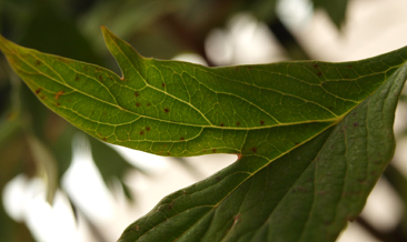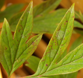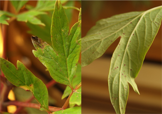 on vient de m'offrir une pivoine arbustive et je commence à avoir qques soupçons quand à sa santé: elle n'est pas très haute (40 cm) et j'ai remarqué plein de petits points rouges sous et sur les feuilles, et les jeunes poussent se tournent vers le bas!