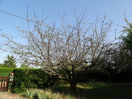 Je vous laisse admirer le désastre .... L'autre cerisier Et le prunier dont nous avons très peur qu'il ne tombe malade à son tour, si ce n'est déjà fait. On pense que c'est le champignon de la maladie criblée, j'ai compris que le traitement c'était pulvériser de la bouillie bordelaise,