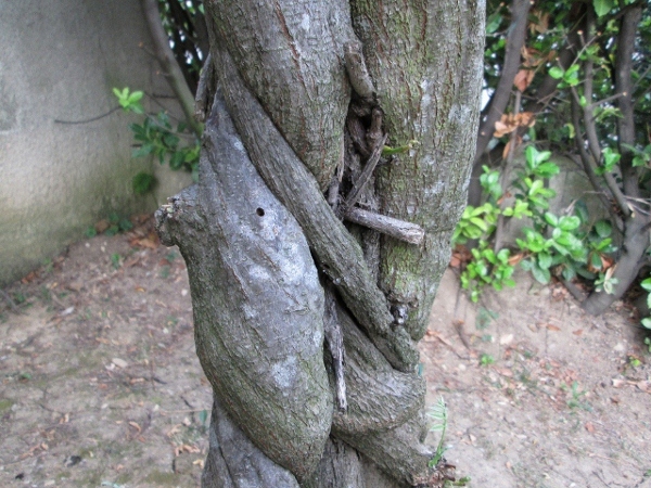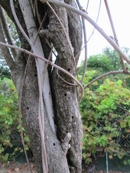 J'ai plusieurs gros plants de glycine qui sont répartis de part et d'autre de ma terrasse - photos 1 et 2. L'an dernier, après avoir fleuri normalement au printemps, le pied de gauche a perdu toutes ses feuilles en qqs jours en juillet. Il y a des trous dans le tronc et le pied se délitte, il est vraiment mort (les feuilles vertes au dessus du pied de gauche appartiennent en fait à un pied de droite) - photos 3, 4 et 5 Depuis une semaine, un des pieds de droite a perdu ses feuilles sur 3 ou 4 petites branches et ça m'inquiète beaucoup. Surtout qu'il commence aussi à y avoir quelques trous dans le tronc - photos 6 et 7 Je précise que je n'ai pas du tout arrosé - mais est-ce qu'il y aurait des insectes à cause d'un pied trop sec ?