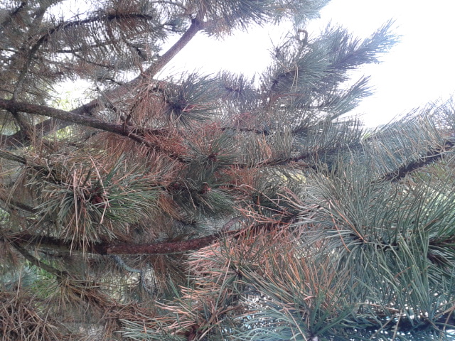 Depuis quelques temps, ce grand pin perd des aiguilles en quantité importante, a priori en commençant par le bas de l'arbre, et plutôt du tronc vers le bout des branches. La chute des aiguilles prend des proportions inquiétantes : elles s'en vont par poignées entières, et le problème gagne vers le haut de l'arbre. Je crois discerner des petits points noirs à la base des aiguilles malades, de la taille d'une tête d'épingle. Pas d'écoulement visible de résine.