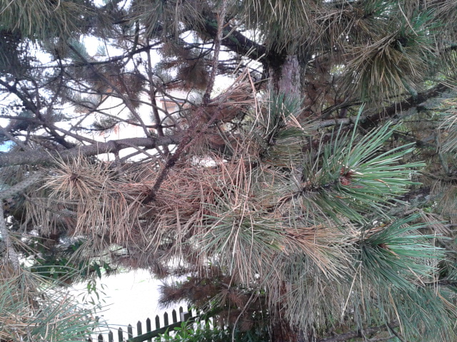 Depuis quelques temps, ce grand pin perd des aiguilles en quantité importante, a priori en commençant par le bas de l'arbre, et plutôt du tronc vers le bout des branches. La chute des aiguilles prend des proportions inquiétantes : elles s'en vont par poignées entières, et le problème gagne vers le haut de l'arbre. Je crois discerner des petits points noirs à la base des aiguilles malades, de la taille d'une tête d'épingle. Pas d'écoulement visible de résine.