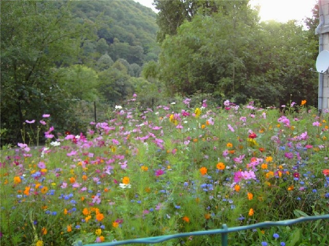 Voilà, ce petit coin n'était pas trop joli, à l'abandon, plein de cailloux. Je me suis fait mal au dos en essayant de dégager un petit "jardinet rond" délimité par les grandes pierres que tu vois (elles étaient "fichées" à la verticale), j'ai abandonné, trop de boulot et pas grand chose qui pousse, donc, on a enlevé toutes les pierres, passé le motoculteur, et semer de la prairie en principe triennale. Du coup, pas d'entetien, j'ai juste fauché à l'automne (j'ai quand même récupéré qq graines, car si ça repousse, ce sera moins fleuri), ça a le mérite d'être plus agréable à regarder, mais surtout, ça attire les insectes qui butinent et ça, ça me plaît.