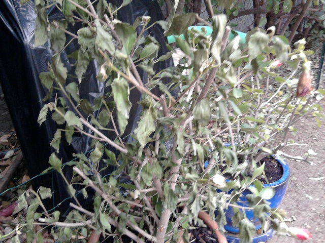 Mon hibiscus a beaucoup souffert du vent ! les feuilles sont fanées, pendent, comme s'il était déshydraté, mais ce n'est pas le cas. Je l'avais taillé l'année, il était superbe. (je précise qu'il vit en pot, dans mon jardin, je suis dans le sud de la France !). Je ne sais pas quoi faire, faut-il enlever les feuilles, les laisser..... je voudrais bien un peu d'aide. J'ai plutôt la "main verte", mais là j'avoue que je suis un peu désemparée ! Merci pour vos conseils éclairés !