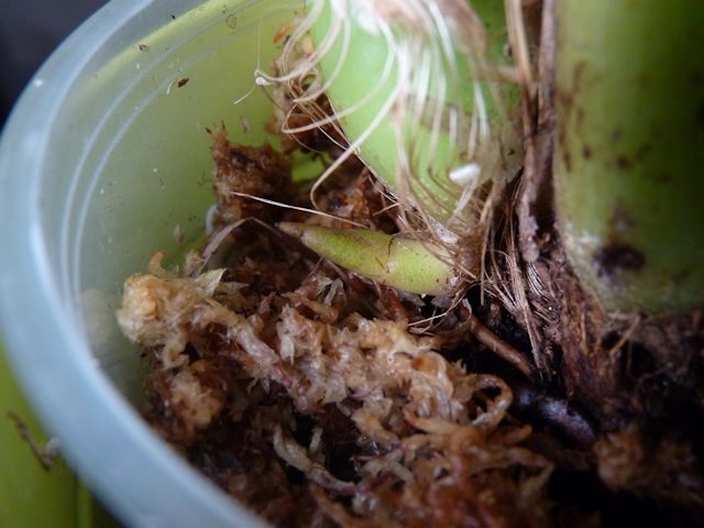 J'avais aussi installé mon phalaenopsis celebensis qui est un assoiffé dans de la mousse du jardin (préalablement traitée à l'huile de nem et congelée pour éviter les bestioles, et cela lui va très bien, pour la 1ère fois, il prépare une hampe. Je pensais le faire aussi cette année sur certaines orchidées à racines fines