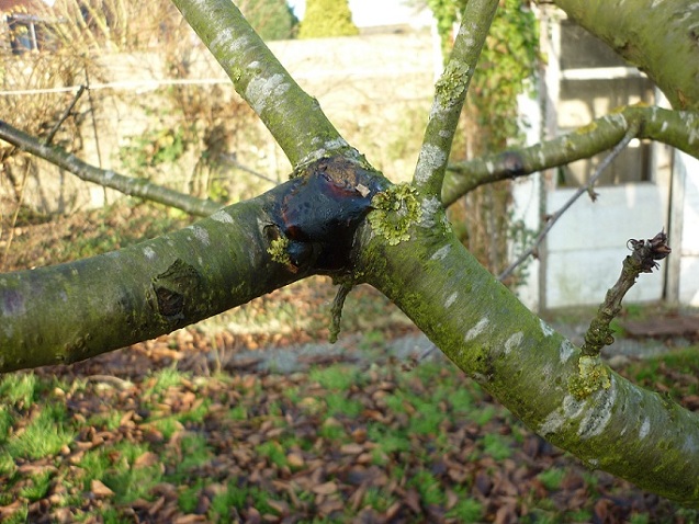 Photo 2: cicatrisation partielle d'une attaque cryptogammique dont le départ a eu lieu sur les branches il y a plusieurs années + charpentières mal soudées le creux retient l'eau et se détériore.