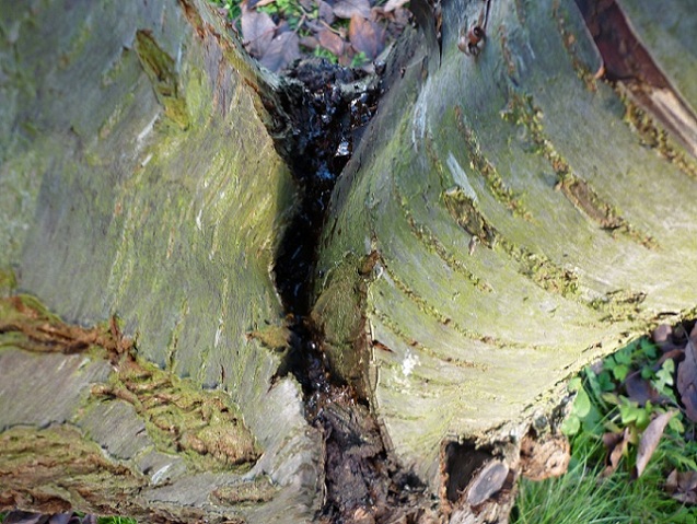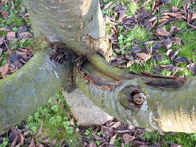Photo 2: cicatrisation partielle d'une attaque cryptogammique dont le départ a eu lieu sur les branches il y a plusieurs années + charpentières mal soudées le creux retient l'eau et se détériore.