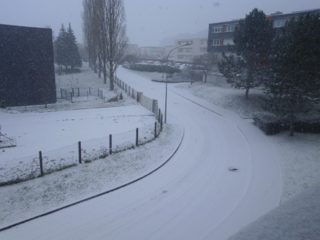 ce matin, pas de neige avant 10 heures, ensuite de gros flocons mouillés qui ne tenaient pas.