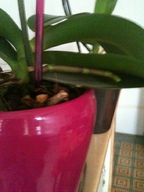 Pour les tuteurs, certains préfèrent laisser la hampe pousser naturellement. D'autres préfèrent quand elle monte. Mais comme elle est déjà bien avancée, fais bien attention d'y aller très doucement, progressivement pour ne pas la casser, c'est vite arrivé! Place le tuteur tout contre le bord du pot, le plus près possible de la hampe, et attache celle-ci au fur et à mesure de sa croissance.