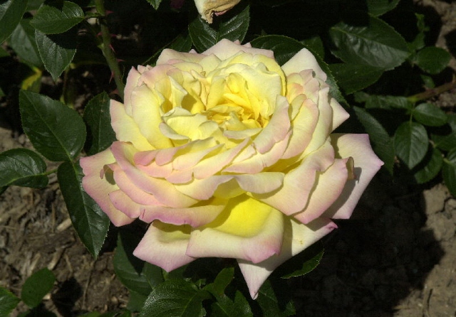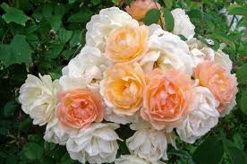 J'ai une ligne qui mélange le jaune et le rouge avec quelques fleurs bicolores. Pour reposer un peu l'oeil, j'ai placé des choisya ternata (au beau feuillage vert lustré et qui titillent les narines de ses fleurettes blanches). Puis vient le feuillage bronze du Ribes suivi d'un coup de foudre : le rosier Ghislaine de féligonde (il fleurit en blanc avant les copains, puis se teinte d'abricot lorsque les rosiers Chicago Peace, Papa Meilland, Yellow hammer et Soleil Rouge débutent leur floraison).