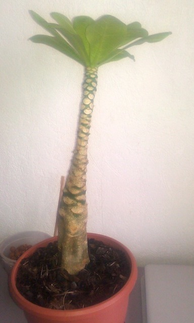 J'ai récupéré ce palmier hawaïen pour le soigner. Le tronc s'était affiné un peu, on pensait qu'il y avait un risque de pourriture donc les arrosages avaient été encore plus rares. En parcourant un peu le forum, il semblerait que ça soit plus un manque d'eau et donc la soif qui rende le tronc aussi fin. La tête du palmier est bien verte, les feuilles poussent et au milieu en arrivent de nouvelles: ce qui me fait dire que le tronc n'est pas pourri. À votre avis, c'est bien un manque d'eau? Si oui, comment réguler l'arrosage pour le rétablir et faut-il y apporter de l'engrais?