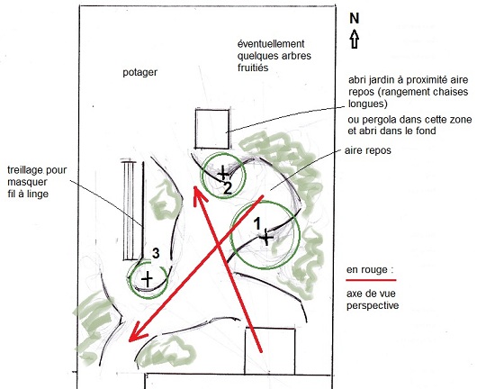 Tu n'as pas prévu, au coeur du jardin, une zone de repos/arbre/ombre ? Je n'ai peut-être pas bien vu.