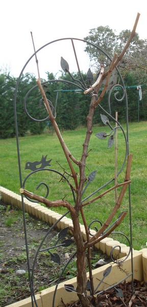 Il en effet créer les troncs en gardant pour les deux pieds le sarment le plus droit à attacher à la verticale et ne laisser pousser que les 3 bourgeons les plus haut.