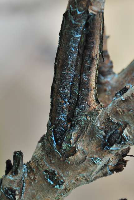 La cicatrisation des branches taillées se fait très lentement, les bourrelets de renforcement de la liaison des branches est faible. Il y a un peu de gomme (la laisser) et des exsudats sur lesquels on voit de la fumagine (noir et pas grave).