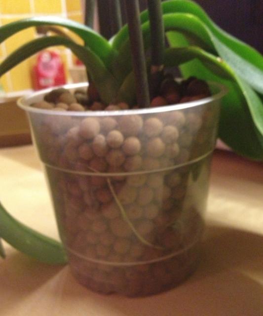Du coup je me retrouve avec une orchidée tous filaments à l'air, dans un pot en plastique transparent avec des billes d'argile et un cache-pot.