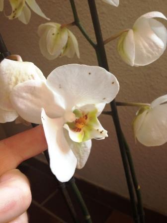 voici les photos des petites tâches noires et marrons sur mon orchidée blanche (la rose n'est pas infectée pour l'instant)...