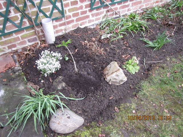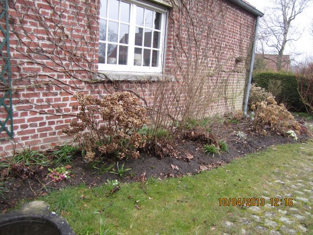 puis j'ai continué : avant : mais me suis arrêtée là : la suite demain . Un peu ennuyée quant à l'état des hortensias beaucoup de branches sèches, et peu de boutons ?? j'ai taillé mais ?? pas jojo !!. sinon ai redéplacé l'hydangea feuilles de chêne l'ai mis à la place du fuschia que j'ai retiré pour les cops!! j'espère qu'il se plaira .