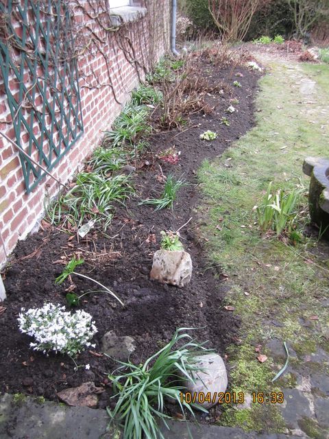 cet aprem j'ai ENFIN .. pu bien jardiner en voici la preuve . Crevée ? oui pas mal !! .. Heureuse .. oh oui alors car j'ai avancé pas aussi vite que je ne l'avais pensé .. je n'ai pas fini le massif !! encore le bout, la taille des plantes mortes et les bordures je ne me sers pas de mon coupe bordure !! je le fais à la bêche ... je n'aime pas de trop .. mon mari n'est pas ravi !! il est dans la cabane