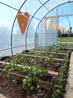 quand j'ai installé ma serre, j'ai fait des trous dans les arceaux et j'ai passé une corde sur toute la longueur, c'est de cette corde que je vais faire descendre d'autres cordes jusqu'aux pieds de tomates.