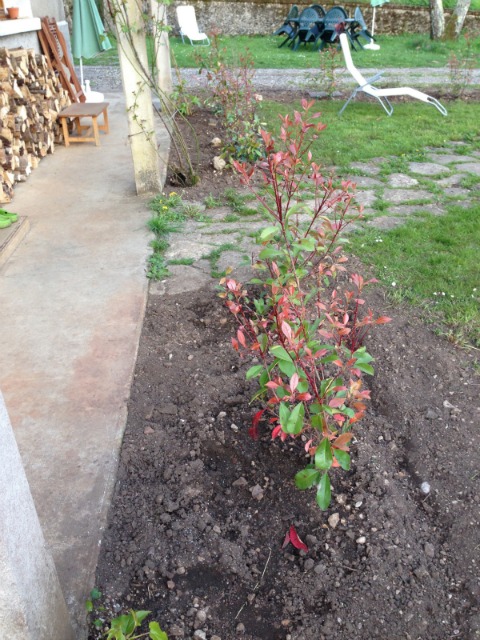 Nous venons de faire une haie de Photinia Red Robin (en photo ci dessous) devant notre maison et il y a une sorte de petit "perron" sous lequel nous abritons notre bois, un petit banc... etc.