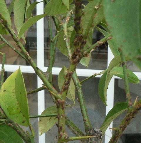 J'avais rentré mon citronnier à l'intérieur pour cet hiver et des "taches" sont apparues sur les feuilles et les branches (voir photo). Ce ne sont pas exactement des taches, ça s'enlève en grattant, c'est un peu visqueux une fois écrasé. Et je pense que c'est ça qui faisait que le sol autour du pot est tout collant. Est-ce une maladie ? Comment la soigner ?