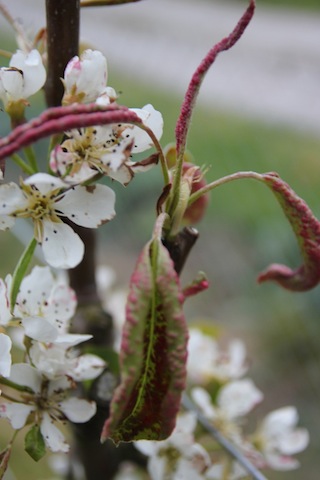 cecidomyie des feuilles de poirier pour être précis.Si vous arrivez à dérouler une feuille, vous y verrez des petits vers blancs .Il faut intervenir dès la chute des pétales, mais comment???