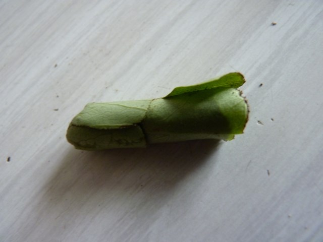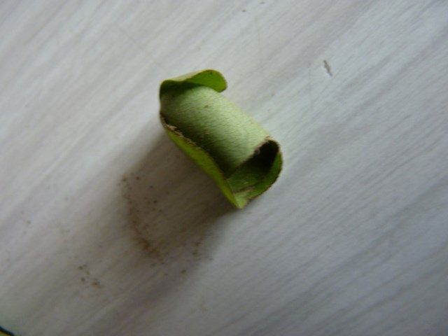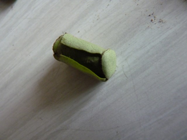J'ai décortiqué tout doucement le cocon, 6 ou 7 feuilles ont servi, et j'ai trouvé une petite chenille ou ver à l'intérieur, ce cocon était sacrément bien fermé, tout ressemblait à un petit bouchon.