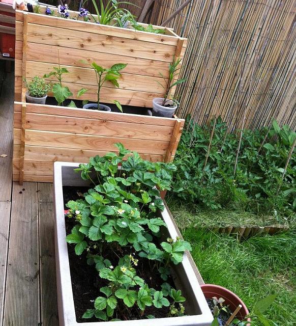 Voici des photos de mon petit bout de terrain, de ma jardinière en bois, et de mon bac à fraisiers !!