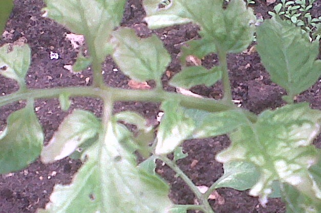 Voilà, un seul de mes pieds de tomate présente des feuilles décolorées comme celles-ci, et seulement une semaine après la plantation.